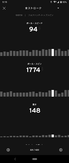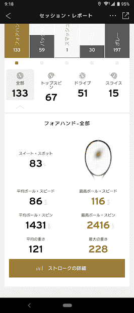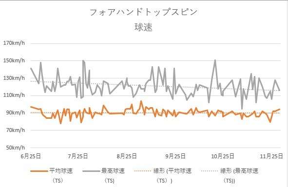 ちなみにヘッドのセンサーでは1200rpm以上がトップスピンと判定されるようなので(例外もある)、ちゃんとスピンをかけて相手のコートに打ち込んでるときの平均球速は90km/hとなってます。